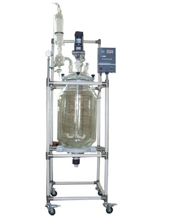 双层玻璃反应釜 用途:玻璃反应釜为双层玻璃设计,内层放入反应溶媒可做搅拌反应,夹层可通上不同的冷热源(冷冻液,热水或热油)做循环加热或冷却反应。在设定恒温条件下,在密闭的玻璃反应釜内,可根据使用要求在常压或负压条件下进行搅拌反应,并能做反应溶液的回流与蒸馏,是现代精细化工、生物制药和新材料合成的理想中试、设备.